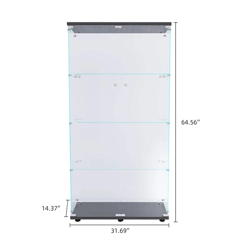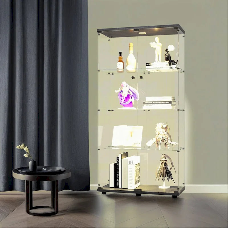 Lighted Two Door Glass Cabinet Glass Display Cabinet with 4 Shelves, Black
