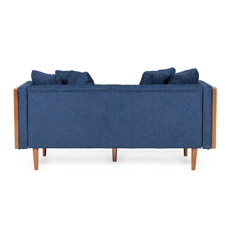 Bring home timeless appeal to create the perfect seating ensemble. Our loveseat brings a retro mid-century modern aesthetic to your interior space, easily anchoring your decor in an atmosphere of sophistication. Featuring charming button-tufted upholstery and a rich wood-like frame, this loveseat stands as a streamlined statement piece that can change the whole flow of your living room, creating an open, clean space. Finished with tapered wood legs and four plush accent pillows, our loveseat provides a refined touch to any home.