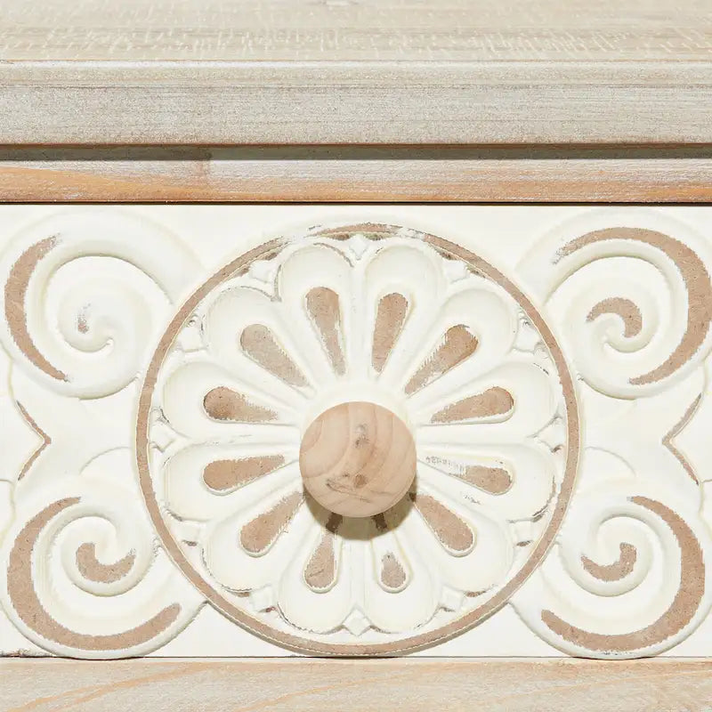 - Long console table features a whitewashed wooden finish and a distressed white scrollwork pattern design
